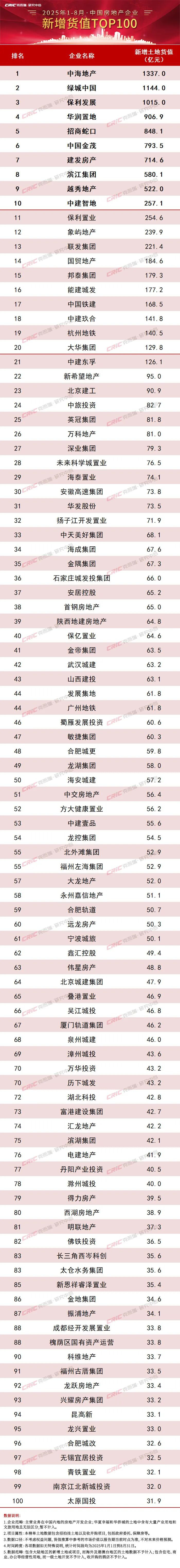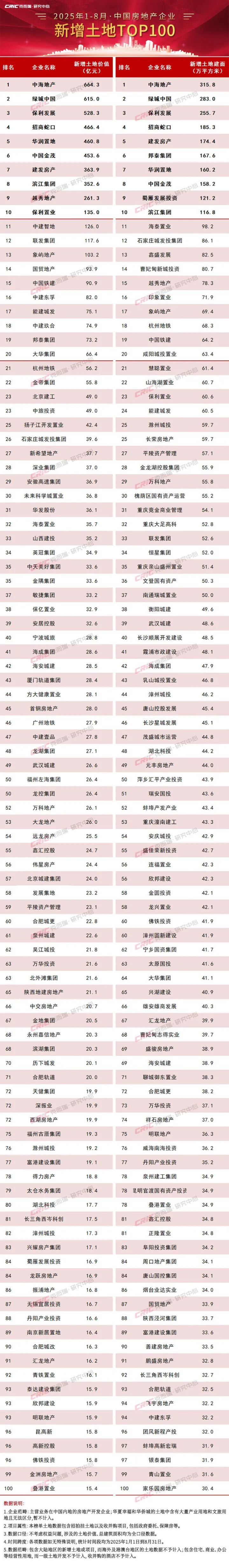 截止至2025年8月末,新增土储百强房企的新增货值、总价和建面百强之和分别为14193亿元、7235亿元和6110万平方米,货值同比增长17.5%,金额同比增长30.8%,建面同比微跌1%。
